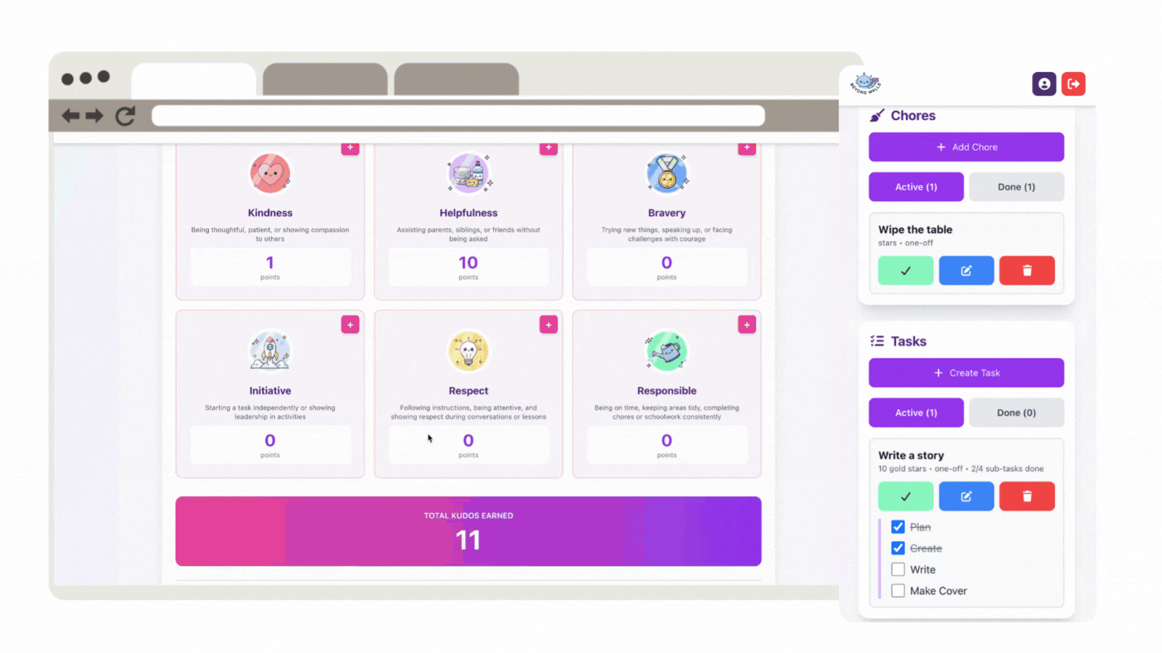 Kudos and Badges celebrate your child's character, effort, and consistency — not just their tasks. While stars track daily progress, badges recognise who your child is becoming: kind, brave, responsible, and resilient.