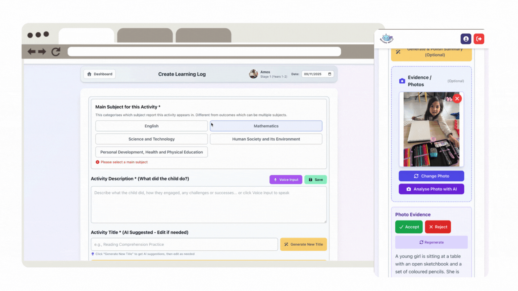 You can record your child's learning moments, track progress, and see what outcomes they've achieved. Each log can include notes, photos, and automatically tagged subjects and outcomes.