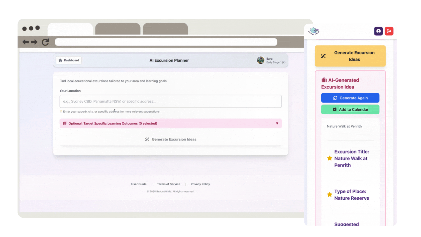 The AI will suggest nearby or theme-based excursion ideas such as parks, museums, or galleries.