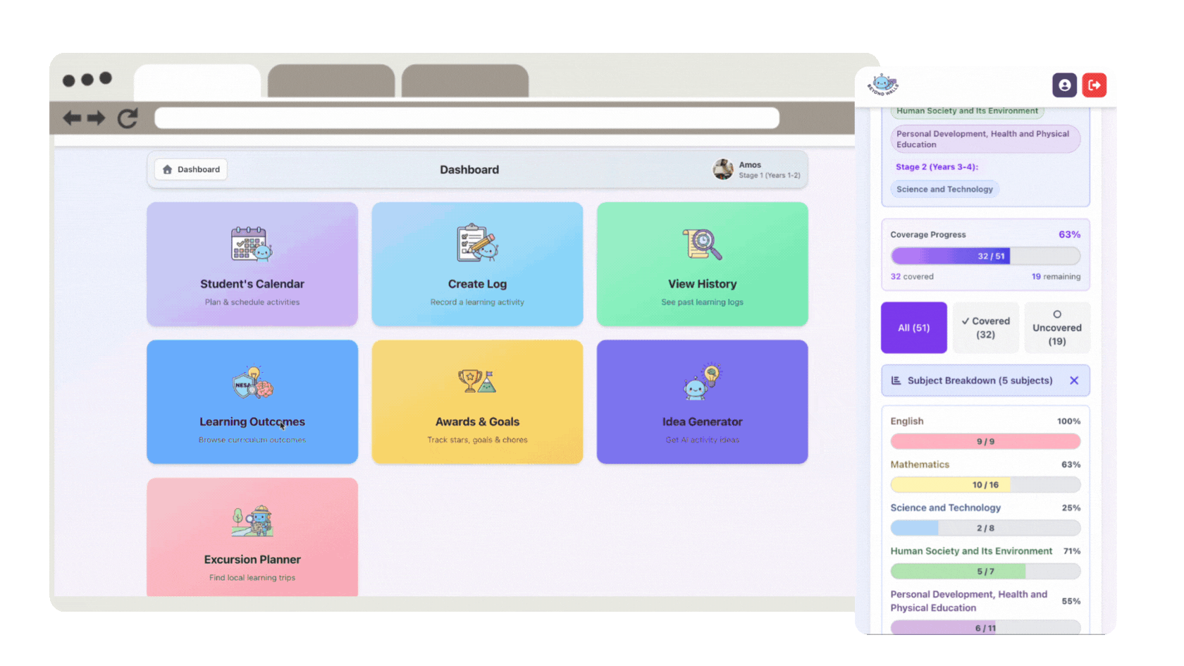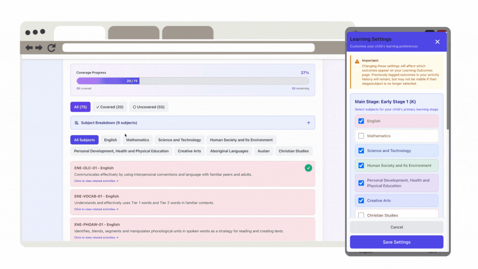 The Learning Outcomes page helps you manage how learning outcomes appear and are tracked for each child. In the Settings, you can select the right stages, subjects, and visibility preferences to match your child's learning plan.